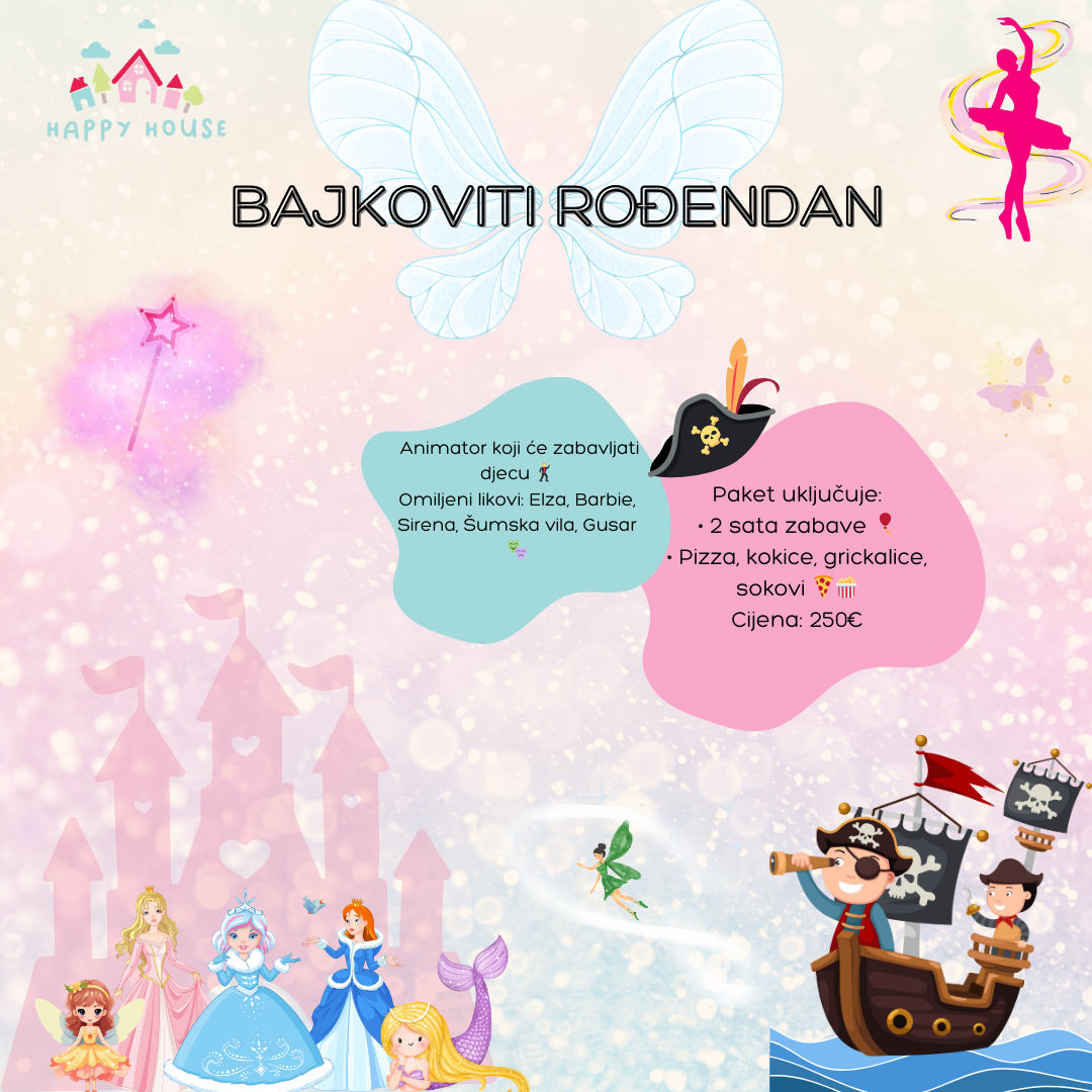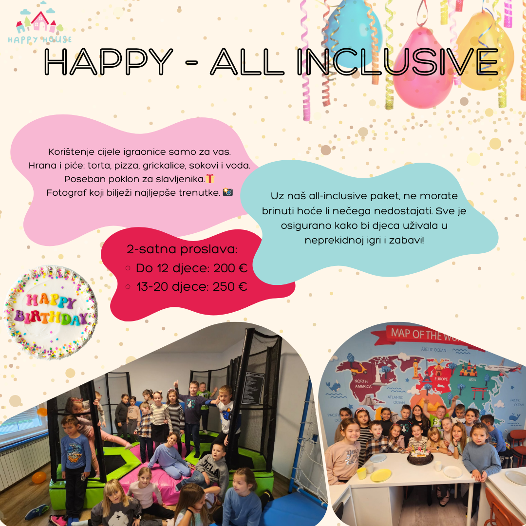 Priredite svom djetetu nezaboravnu rođendansku proslavu s našim Happy house paketom! Uživajte u bezbrižnom slavlju dok mi brinemo o svemu – od igre i animacije do hrane i fotografija.